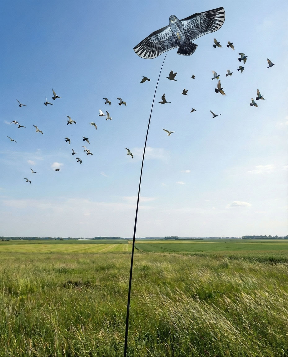 | Список характеристик | Отпугивает: голубей, воробьев, скворцов, чаек, дроздов, сорок и др.птиц¶Эффективный радиус действия — до 70 м (в пределах видимости)¶Усиливает эффективность работы биоакустических отпугивателей¶Прочный и гибкий каркас из стеклопластика,¶Обтянут нейлоновой тканью, которая легко выдерживает любые атмосферные явления¶Абсолютная бесшумность |
